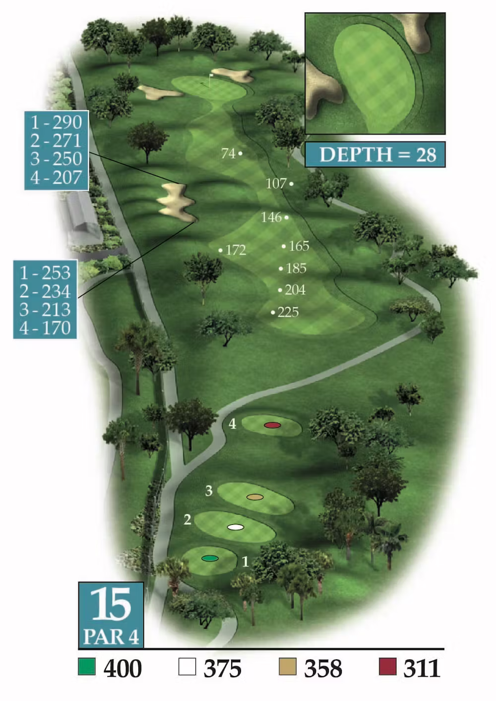 This dogleg left has 2 fairway bunkers on the left hand side. Playing down the right side of the fairway will give you a mid iron into this green.